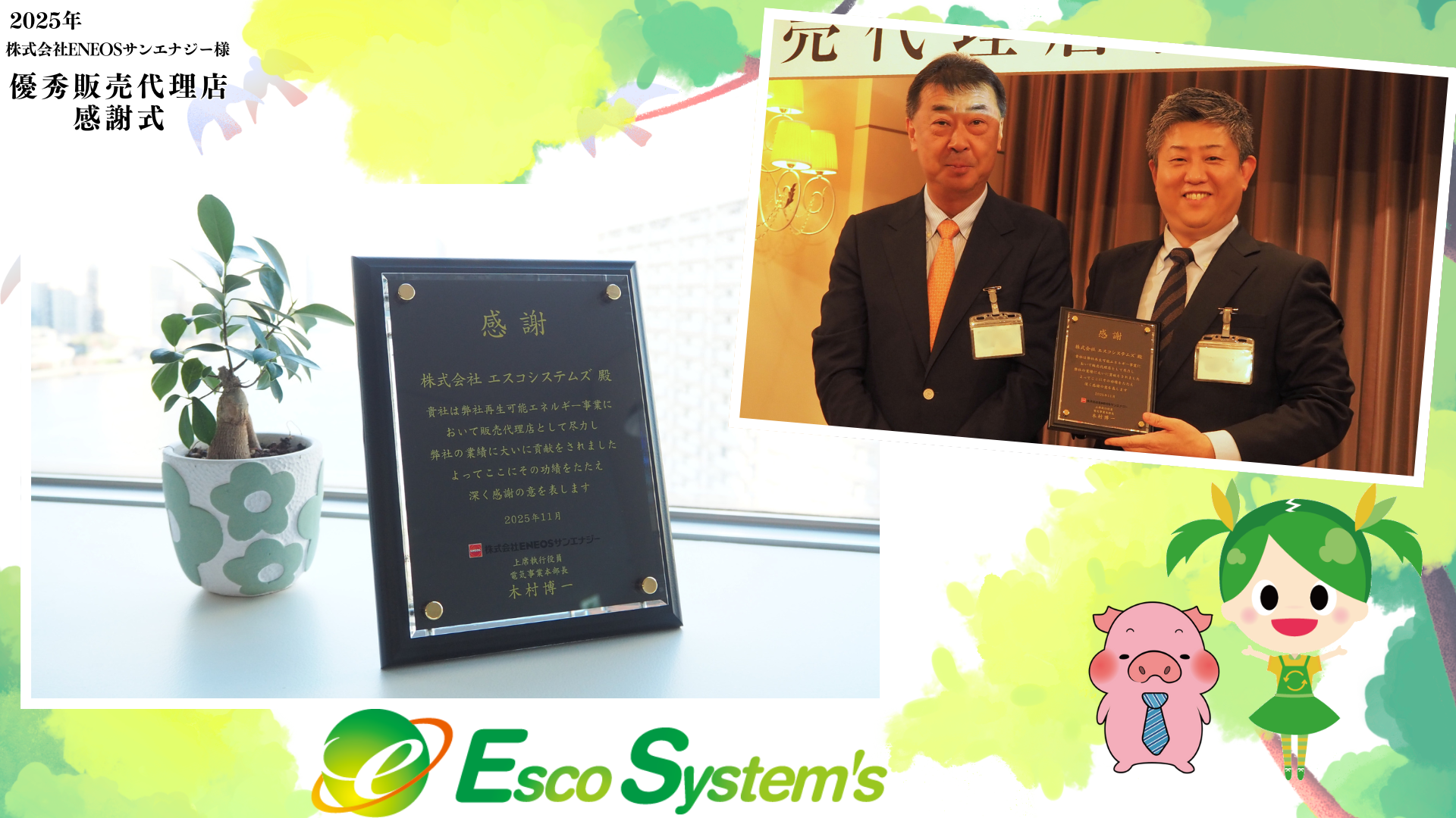株式会社ENEOSサンエナジー様の再生可能エネルギー部門において、当社の太陽光発電システムなどの提案実績を高く評価していただいたものとなります。